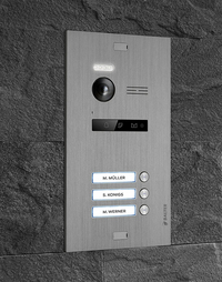 1× Unterputz-Türstation aus Aluminium für 3-Familienhaus Die hochwertige Türstation aus gebürstetem Aluminium begeistert mit zeitlos elegantem Design und sieht auch nach langer Benutzung gut aus. Eine leistungsfähige 150°-Weitwinkelkamera deckt ein besonders breites Sichtfeld ab, um auch Personen, die nicht direkt vor der Kamera stehen zuverlässig abzubilden. Auch Gruppen werden so optimal dargestellt. Dank eines integrierten Hell/Dunkel-Sensors erkennt die Außenstation einsetzende Dunkelheit automatisch und schaltet die Beleuchtung Ihres Namensschilds und der Klingeltaste ein. Leistungsstarke Nachtsicht-LEDs sorgen dafür, dass Sie Besucher auch nachts klar erkennen und identifizieren können. Verdeckte Schrauben sorgen für eine noch höhere Betriebssicherheit. Bei der Installation werden die Befestigungsschrauben mit einer Klappe verschlossen, die nur mit einem speziellen Werkzeug geöffnet werden kann (und selbstverständlich mitgeliefert wird). So wird effektiv verhindert, dass Einbrecher die Anlage abschrauben können. Die Türstation entspricht der Schutzklasse IP44 und widersteht Regen, Staub und Schnee.