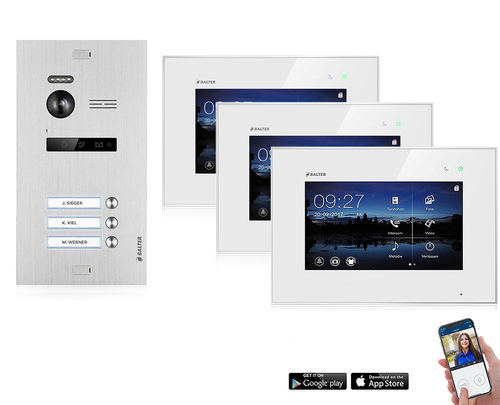 3-Fam. Video Türsprechanlage BALTER EVO 2-Draht BUS Komplettsystem mit Türstation für 3 Teilnehmer, 3x7" WiFi Touchscreen Monitor und Hauptstromverteiler ,